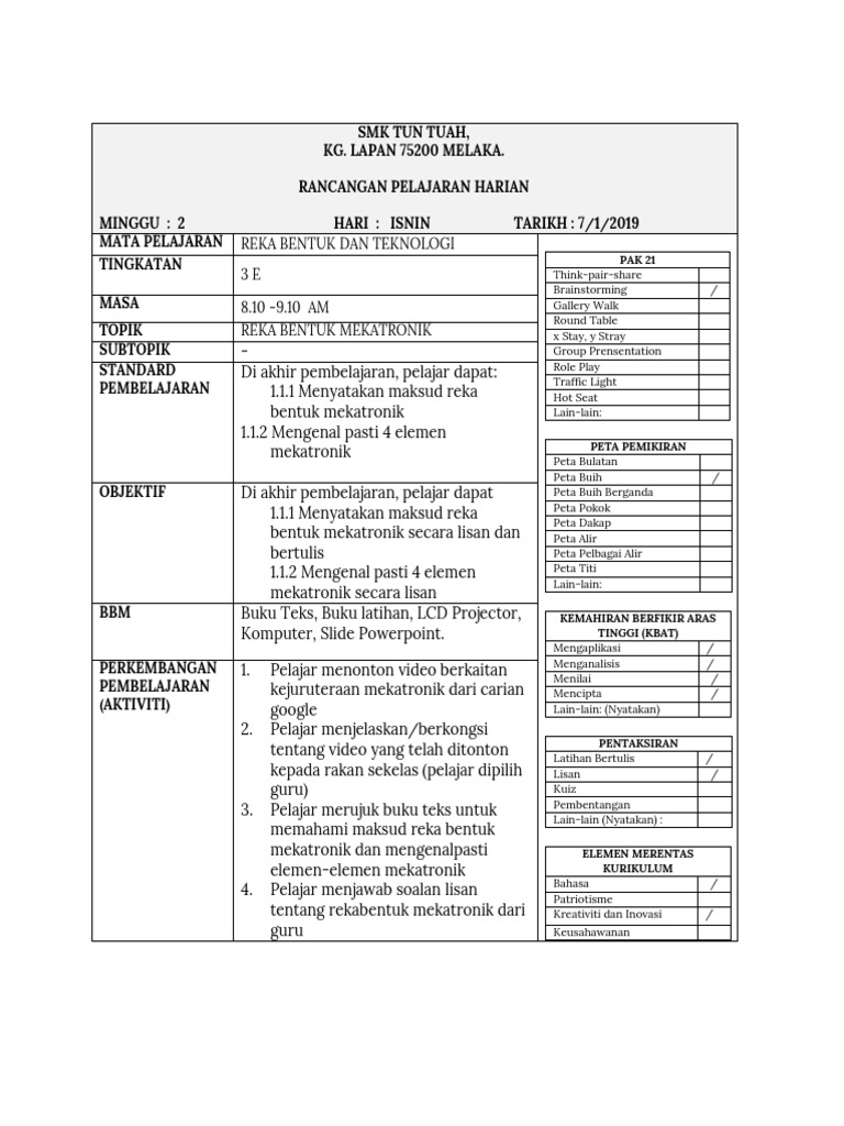 Contoh Rancangan Pengajaran Harian Kssm Tingkatan 2 Ringkas Pdf